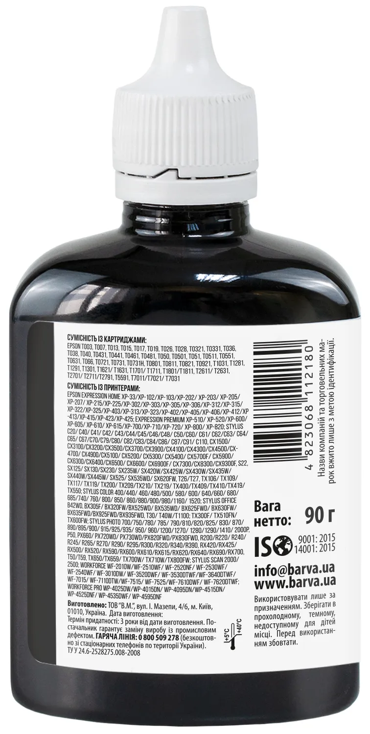 Украинская компания ООО «В.М.» занимается производством чернил под торговой маркой Barva уже много лет. На базе собственной лаборатории осуществляется как разработка новых формул, так и непрерывный контроль качества выпускаемой продукции. При производстве чернил производитель следует стандартам ISO 9001:2015 и ISO 14001:2015.