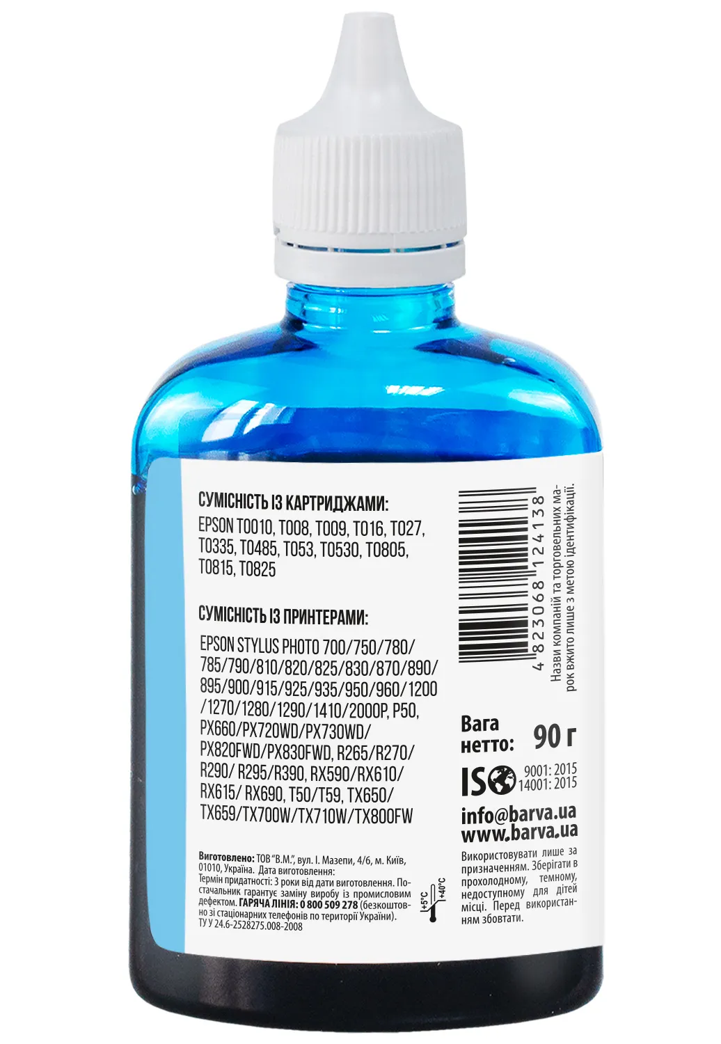 Украинская компания ООО «В.М.» занимается производством чернил под торговой маркой Barva уже много лет. На базе собственной лаборатории осуществляется как разработка новых формул, так и непрерывный контроль качества выпускаемой продукции. При производстве чернил производитель следует стандартам ISO 9001:2015 и ISO 14001:2015.