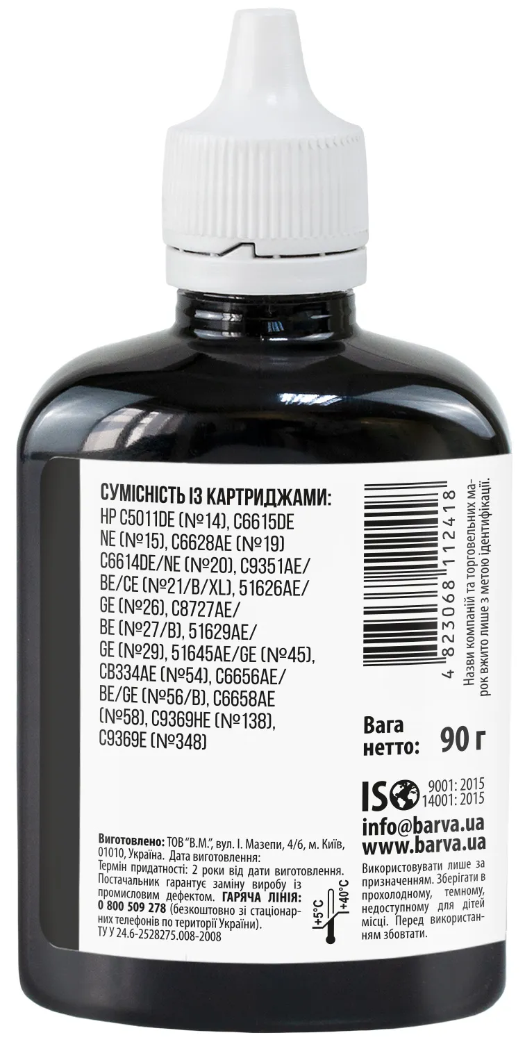 Украинская компания ООО «В.М.» занимается производством чернил под торговой маркой Barva уже много лет. На базе собственной лаборатории осуществляется как разработка новых формул, так и непрерывный контроль качества выпускаемой продукции. При производстве чернил производитель следует стандартам ISO 9001:2015 и ISO 14001:2015.