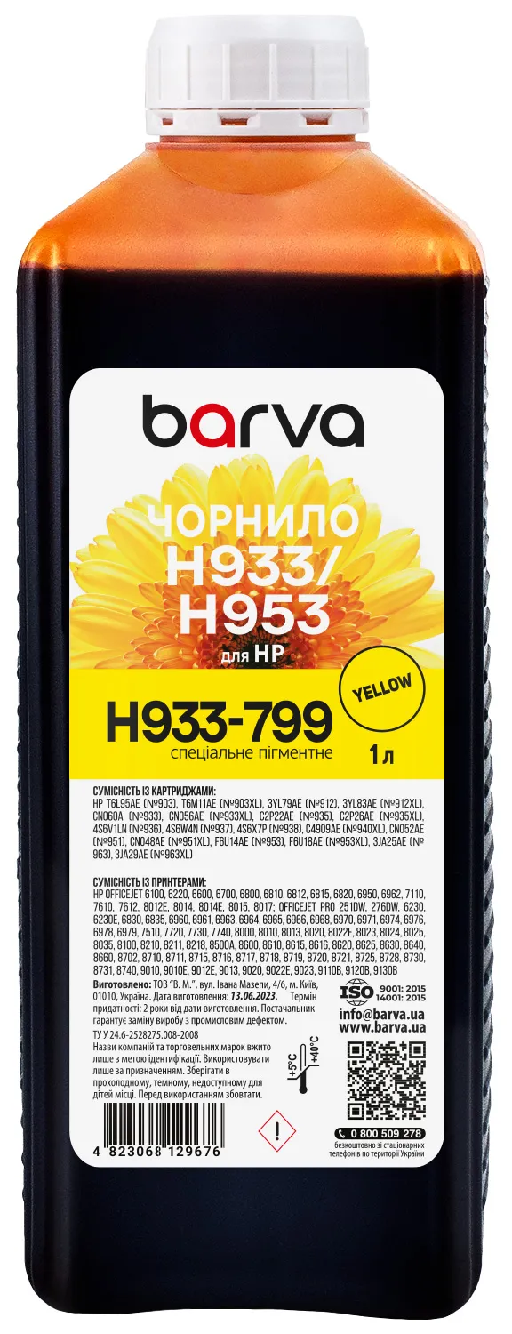 Многие из нас слышали, что в отличие от лазерной техники, которая формирует изображение с помощью тонера, струйная техника использует для печати специальные чернила (краски для принтеров). Чернила для HP 933/951/953 специальные 1 л, пигментные, желтые Barva (H933-799) используются для заправки струйных картриджей, ПЗК или СНПЧ.Чернила H933-799 Barva имеют официальную гарантию от производителя – ООО "В.М.".
