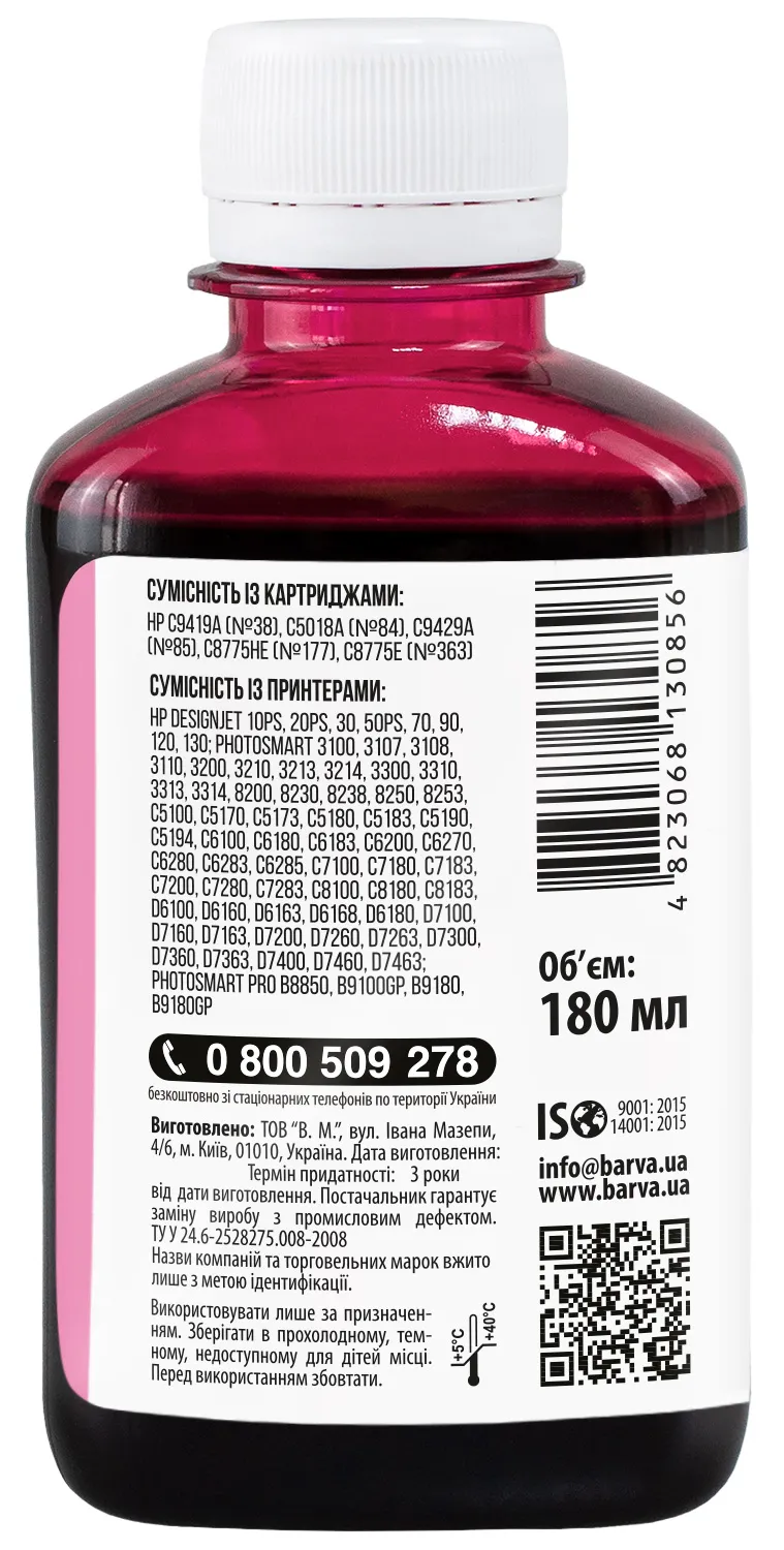 Украинская компания ООО «В.М.» занимается производством чернил под торговой маркой Barva уже много лет. На базе собственной лаборатории осуществляется как разработка новых формул, так и непрерывный контроль качества выпускаемой продукции. При производстве чернил производитель следует стандартам ISO 9001:2015 и ISO 14001:2015.