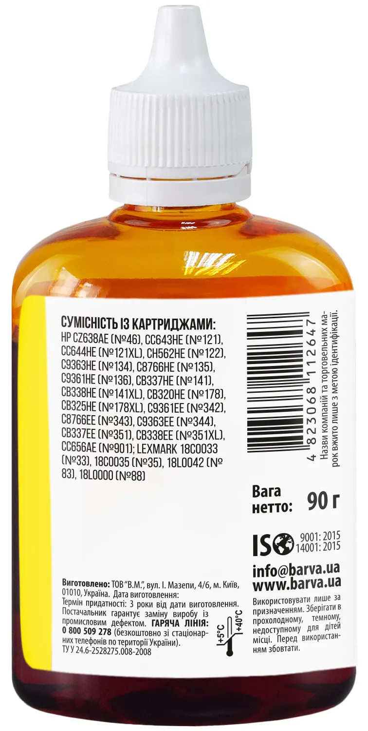 Украинская компания ООО «В.М.» занимается производством чернил под торговой маркой Barva уже много лет. На базе собственной лаборатории осуществляется как разработка новых формул, так и непрерывный контроль качества выпускаемой продукции. При производстве чернил производитель следует стандартам ISO 9001:2015 и ISO 14001:2015.
