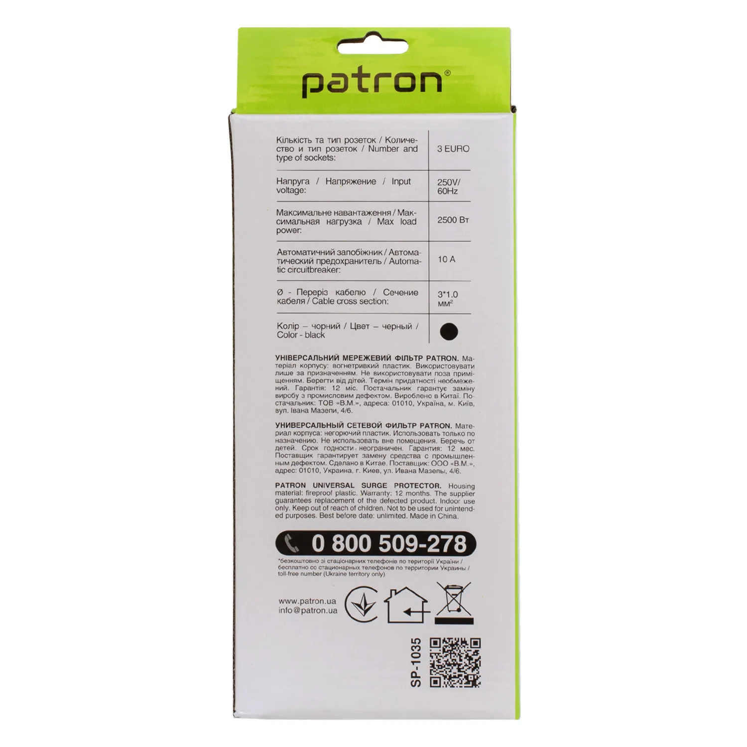 Фильтр сетевой 3 розетки, 1,8 м, 10 А, 250 В, 3*1мм2, черный Patron (SP-1032)