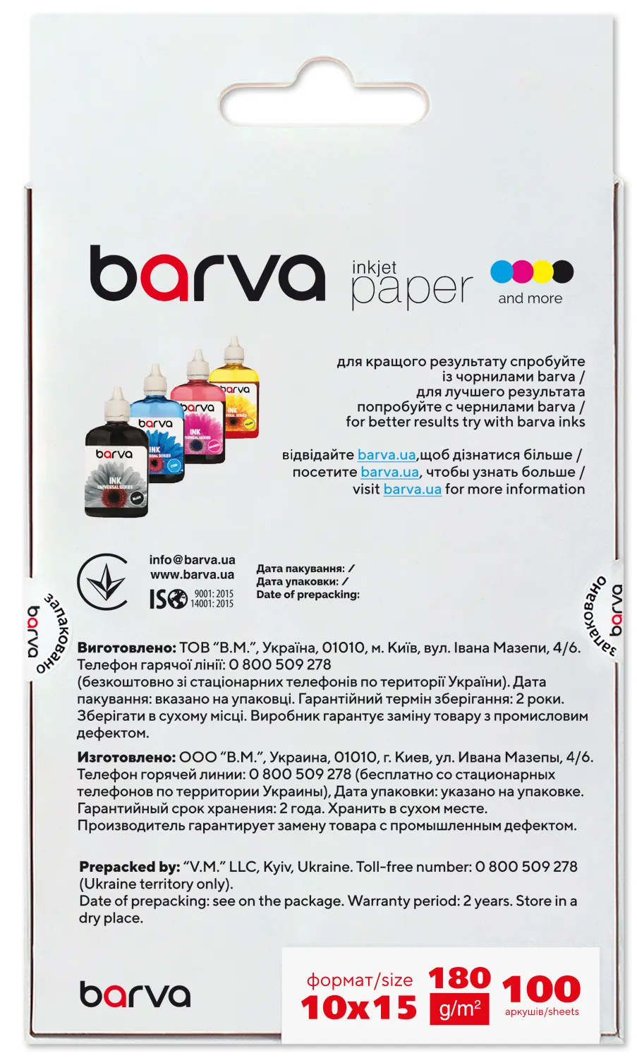 Под торговой маркой Barva на рынок выходит широкий ассортимент материалов для струйной печати, который поможет Вам с выполнением различных задач – от печати фотографий, до изготовления рекламных и маркетинговых материалов. Носители для струйной печати под данной торговой маркой выпускаются на рынок украинской компанией ТОВ «В. М.» с 2003 года и уже успели завоевать доверие пользователей неизменно высоким качеством и доступными ценами.