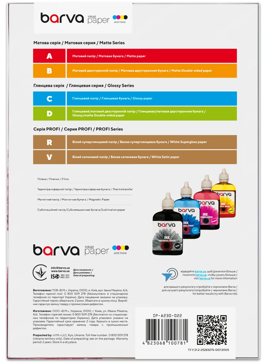 Под торговой маркой Barva на рынок выходит широкий ассортимент материалов для струйной печати, который поможет Вам с выполнением различных задач – от печати фотографий, до изготовления рекламных и маркетинговых материалов. Носители для струйной печати под данной торговой маркой выпускаются на рынок украинской компанией ТОВ «В. М.» с 2003 года и уже успели завоевать доверие пользователей неизменно высоким качеством и доступными ценами.