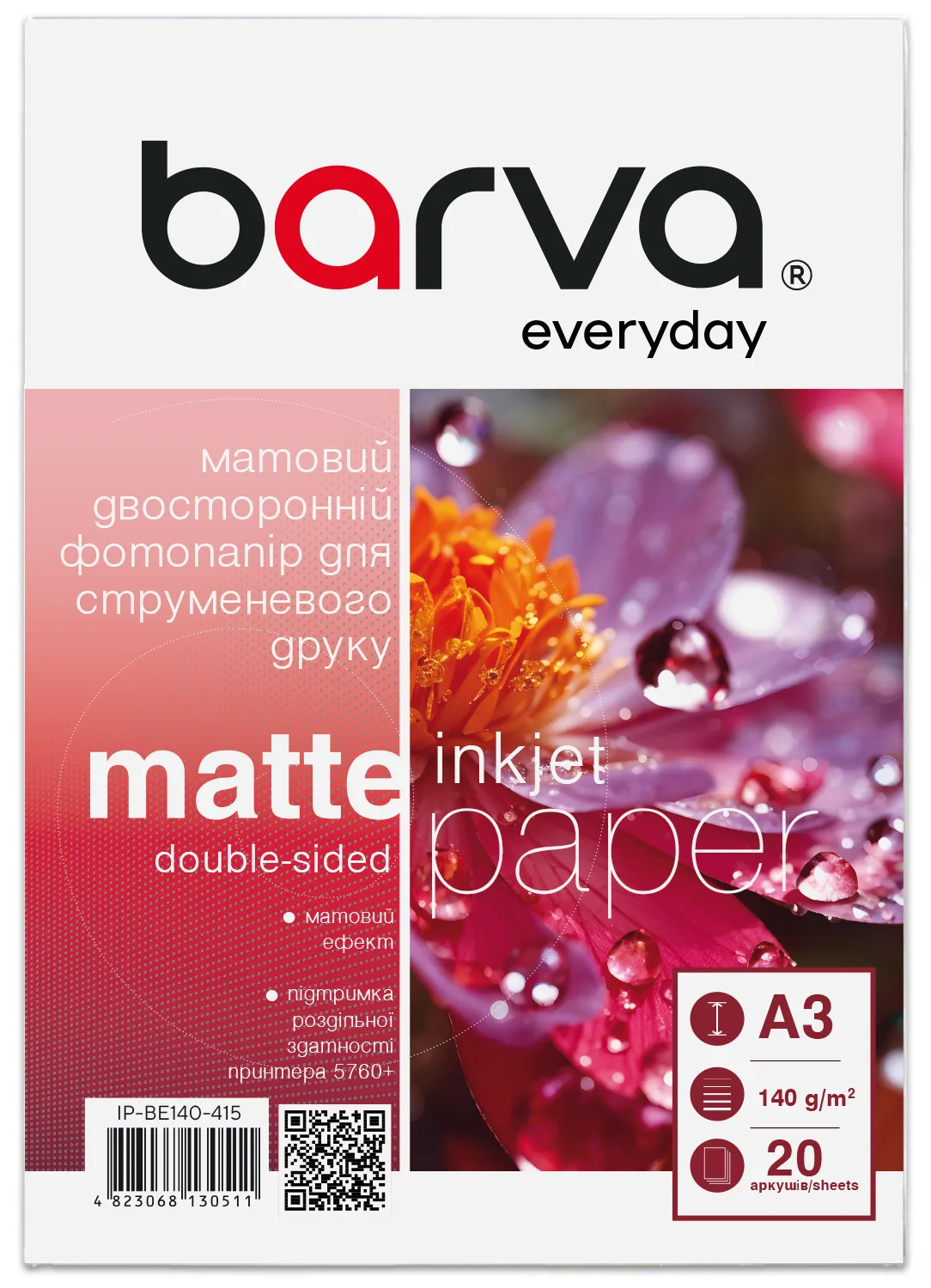 Фотобумага матовая двусторонняя 140 г/м2, A3, 20 л Everyday Barva (IP-BE140-415) описание