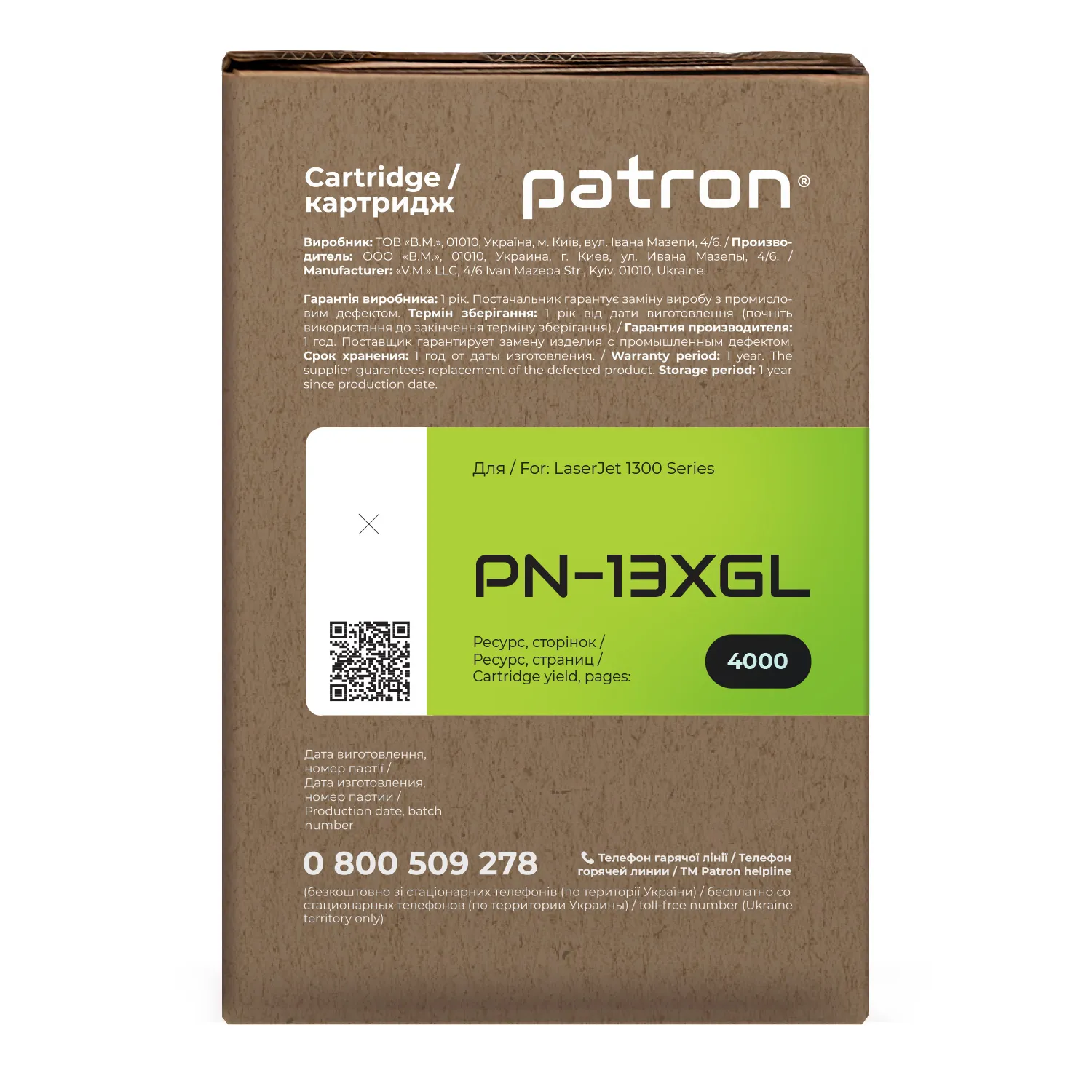 Мы позаботились о том, чтобы упаковка картриджа была не только экологичной, функциональной, имела минимально возможные физические размеры, но и содержала всю необходимую информацию. На зеленой этикетке находится информация о продукте, его совместимости с печатающими устройствами, номер партии, дата изготовления, контакты производителя, а также номер телефона бесплатной горячей линии для украинских потребителей.