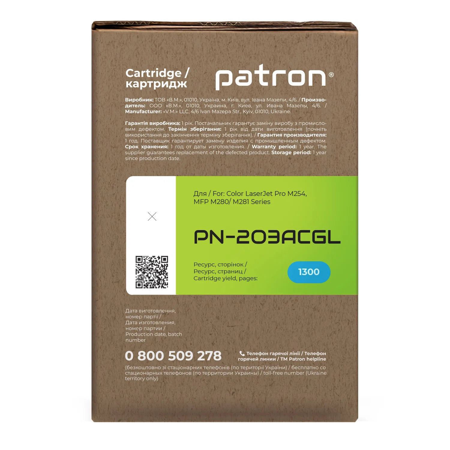 Мы позаботились о том, чтобы упаковка картриджа была не только экологичной, функциональной, имела минимально возможные физические размеры, но и содержала всю необходимую информацию. На зеленой этикетке находится информация о продукте, его совместимости с печатающими устройствами, номер партии, дата изготовления, контакты производителя, а также номер телефона бесплатной горячей линии для украинских потребителей.