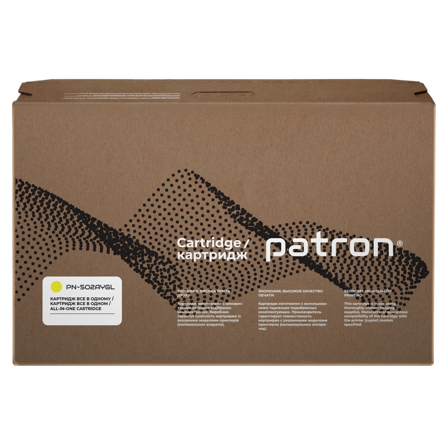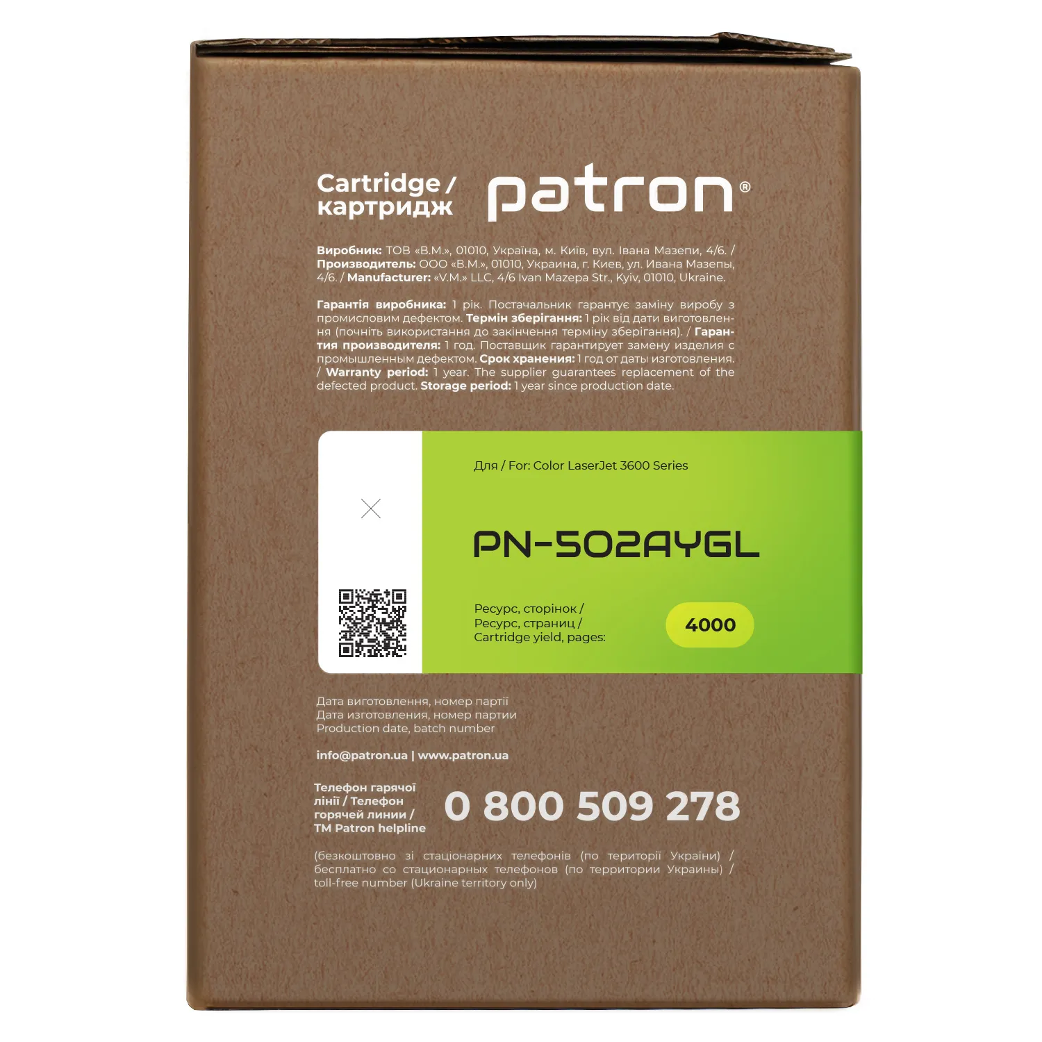 Мы позаботились о том, чтобы упаковка картриджа была не только экологичной, функциональной, имела минимально возможные физические размеры, но и содержала всю необходимую информацию. На зеленой этикетке находится информация о продукте, его совместимости с печатающими устройствами, номер партии, дата изготовления, контакты производителя, а также номер телефона бесплатной горячей линии для украинских потребителей.