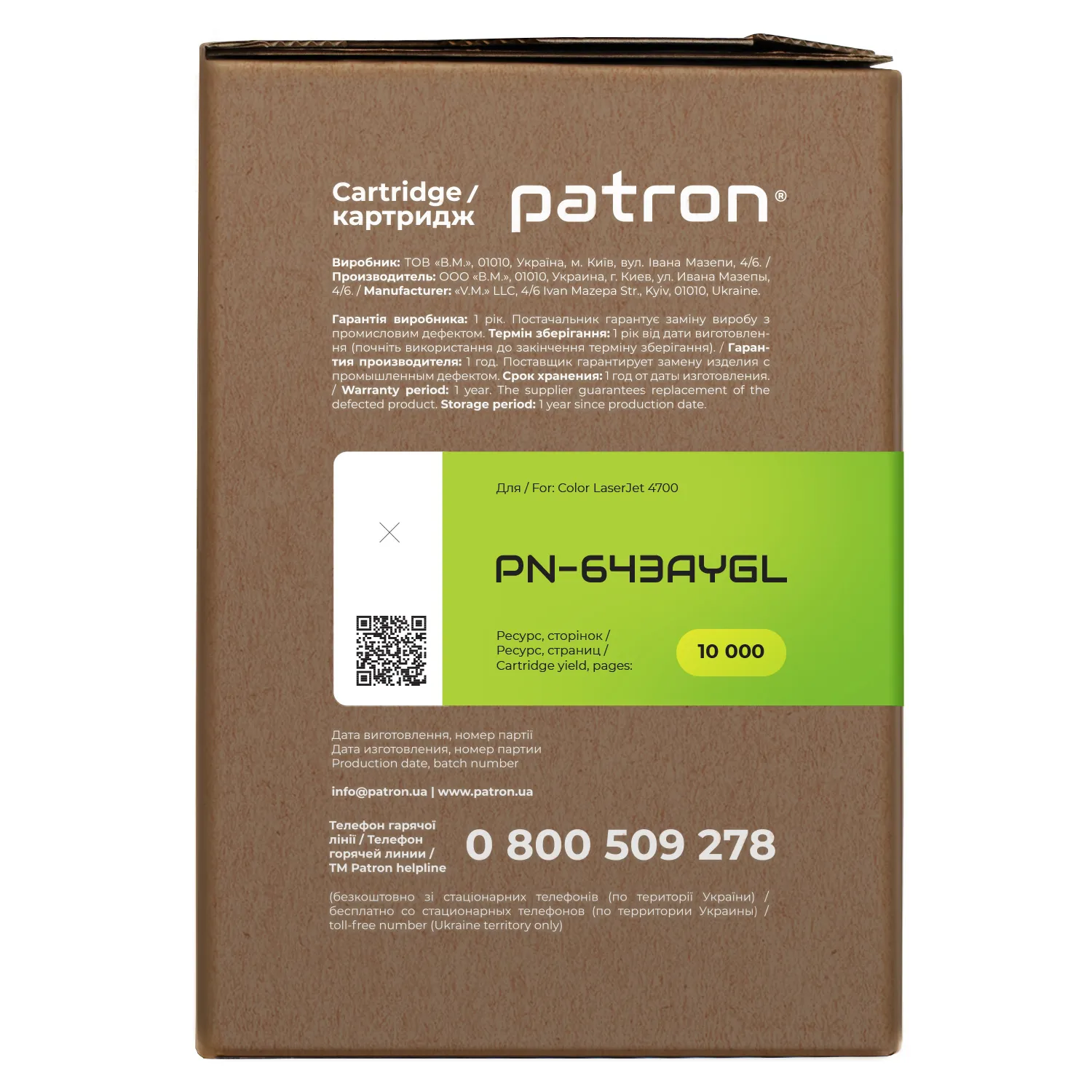 Мы позаботились о том, чтобы упаковка картриджа была не только экологичной, функциональной, имела минимально возможные физические размеры, но и содержала всю необходимую информацию. На зеленой этикетке находится информация о продукте, его совместимости с печатающими устройствами, номер партии, дата изготовления, контакты производителя, а также номер телефона бесплатной горячей линии для украинских потребителей.