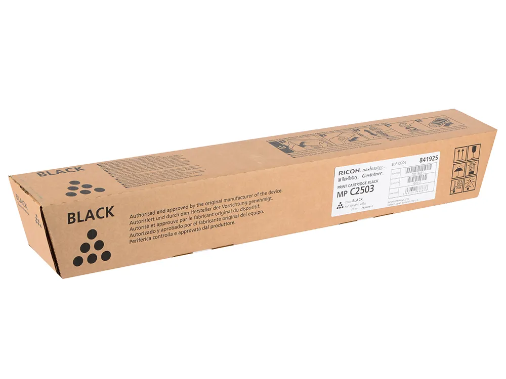 Тонер - картридж 2503-B разработан и изготовлен компанией Ricoh, которая гарантирует высокий уровень качества отпечатков. Можно с уверенностью рассчитывать, что оригинальный картридж для лазерного принтера Ricoh будет безотказно работать на протяжении всего ресурса – 15000 страниц. Тонер-картридж MPC2503 черный Ricoh (841925) относится к группе оригинальных расходных материалов, единственным минусом которых является высокая стоимость.