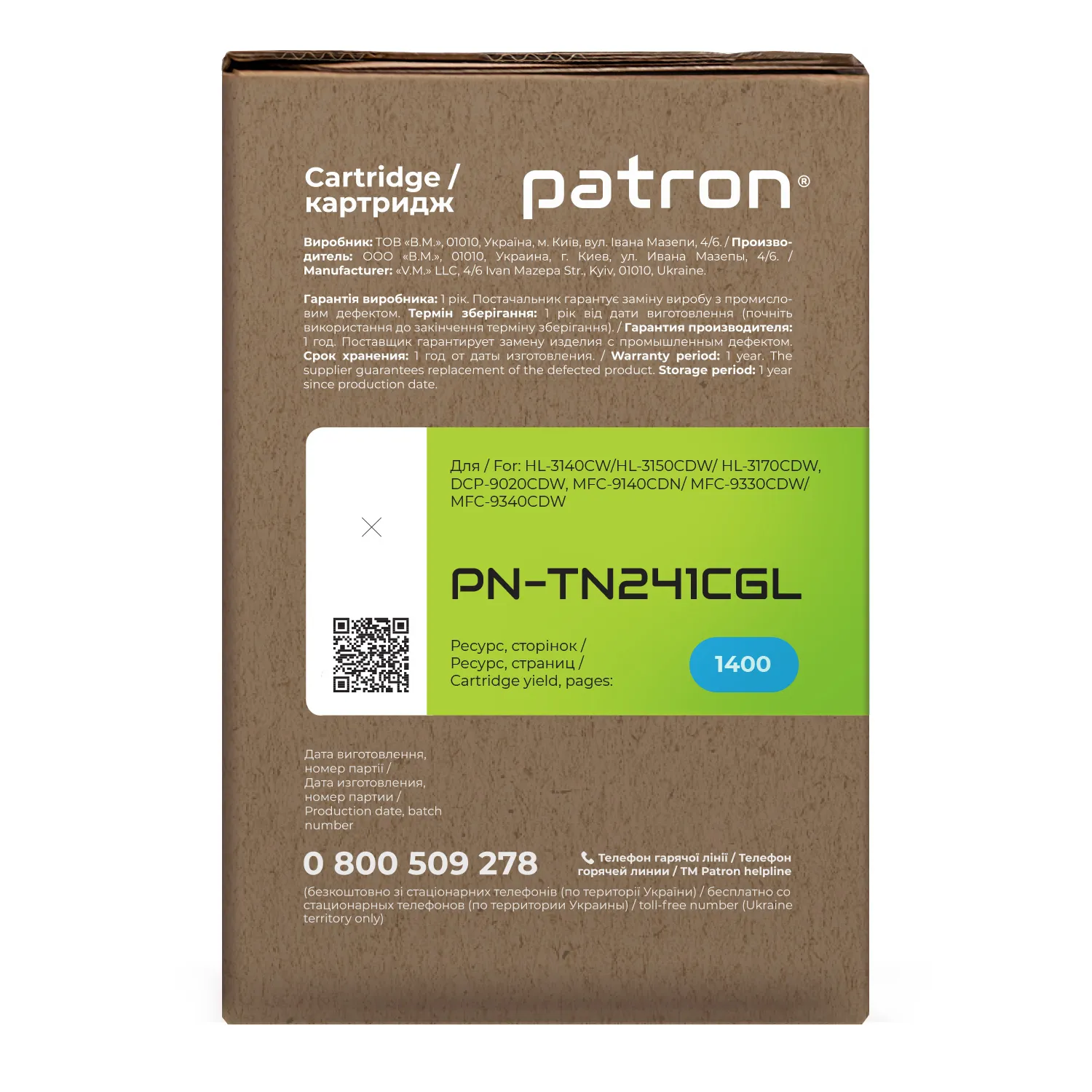Мы позаботились о том, чтобы упаковка картриджа была не только экологичной, функциональной, имела минимально возможные физические размеры, но и содержала всю необходимую информацию. На зеленой этикетке находится информация о продукте, его совместимости с печатающими устройствами, номер партии, дата изготовления, контакты производителя, а также номер телефона бесплатной горячей линии для украинских потребителей.