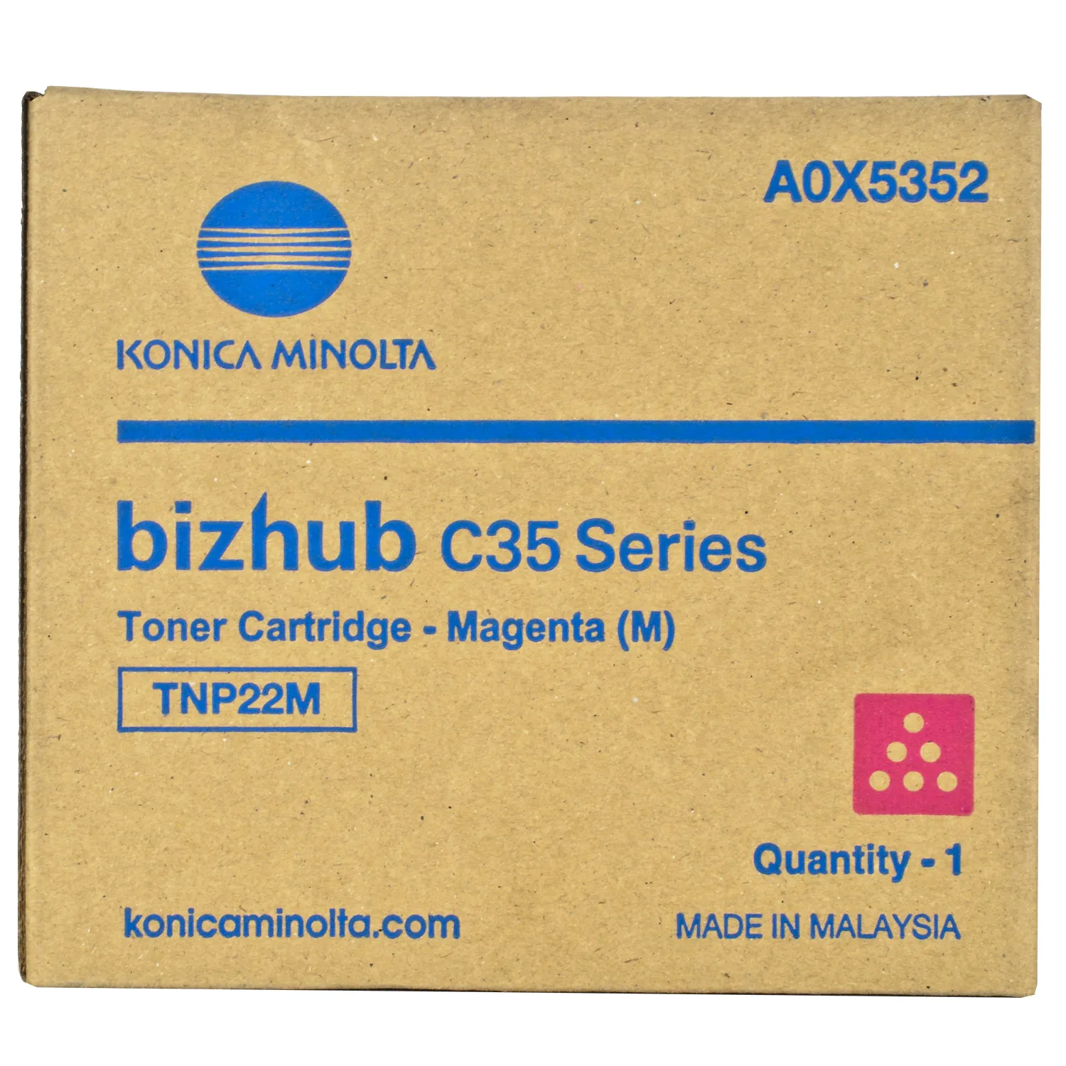 Картридж A0X5352 разработан и изготовлен компанией Konica Minolta, потому является идеальным выбором для безупречного качества отпечатков. Можно с уверенностью рассчитывать, что оригинальный картридж для лазерного принтера Konica Minolta будет безотказно работать на протяжении всего ресурса – 6000 страниц. Тонер-картридж TNP-22M пурпурный Konica Minolta (A0X5352) относится к группе оригинальных расходных материалов, единственным минусом которых является высокая стоимость.