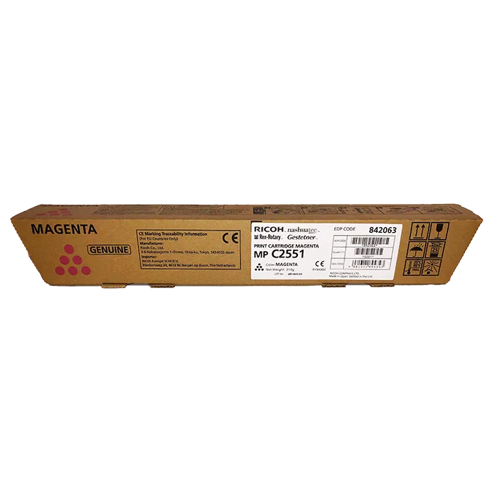 Тонер - картридж MPC2550M розроблений та виробляється компанією Ricoh, тому він є ідеальним вибором для бездоганної якості друку. Можна із впевненістю розраховувати, що оригінальний картридж для лазерного принтера Ricoh буде безвідмовно працювати протягом всього ресурсу – сторінок. Тонер-картридж MPC2551 пурпуровий Ricoh (842063) відноситься до групи оригінальних витратних матеріалів, єдиним мінусом яких є висока вартість.