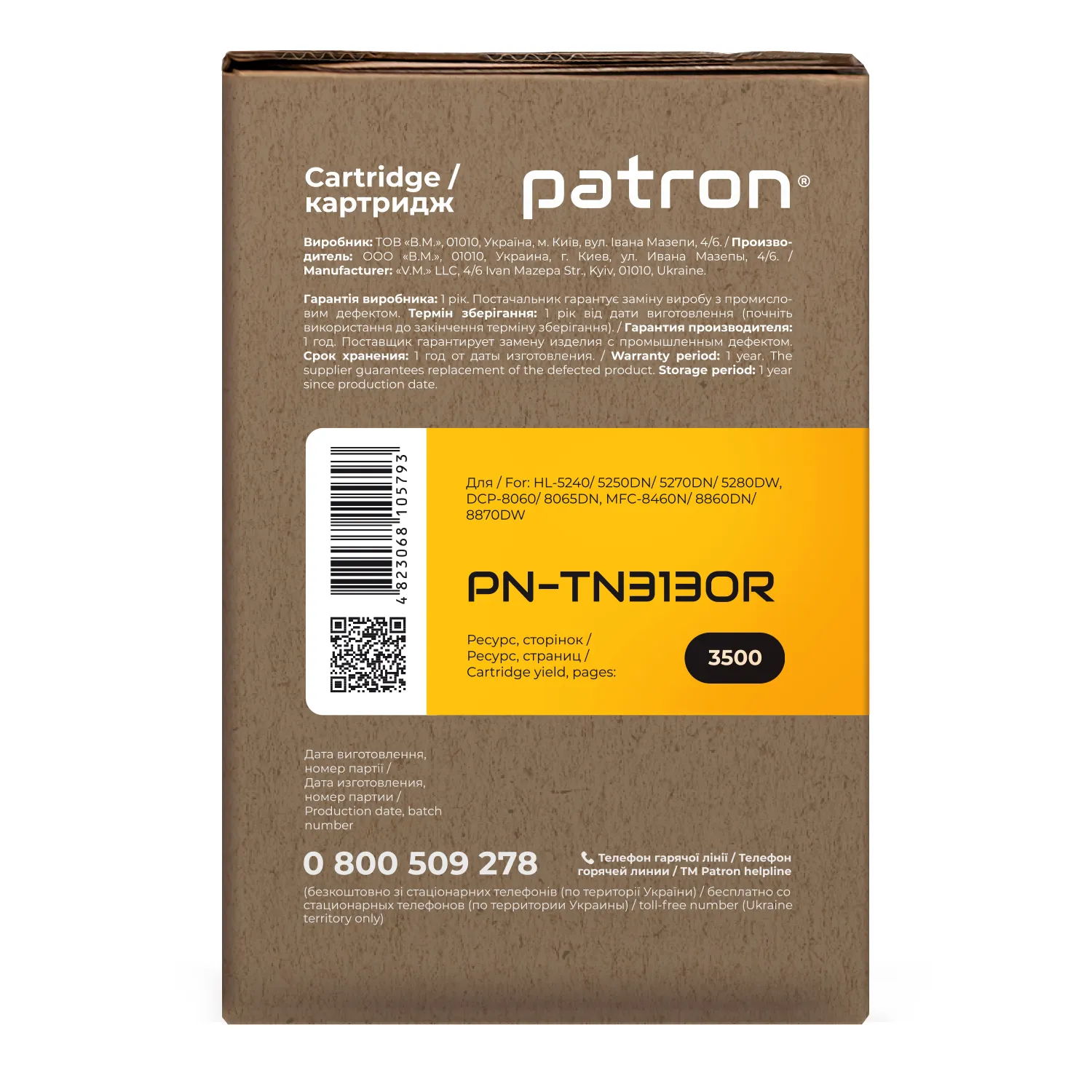 Ми потурбувалися про те, щоб упаковка картриджа була не лише екологічною, функціональною, мала мінімально можливі фізичні розміри, але і містила усю необхідну інформацію. На яскраво-помаранчевій етикетці знаходиться інформація про картридж, його сумісність з друкувальними пристроями, номер партії, дата виготовлення, контакти виробника, а також номер телефону безкоштовної гарячої лінії для українських споживачів.
